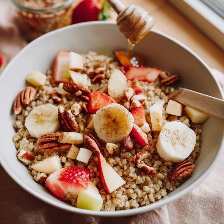 Fresh berries, sliced bananas, diced apples, or pears add natural sweetness. For crunch, try almonds, walnuts, pecans, or seeds like chia and flax. Cinnamon, nutmeg, or cardamom enhance the natural nutty flavor beautifully.