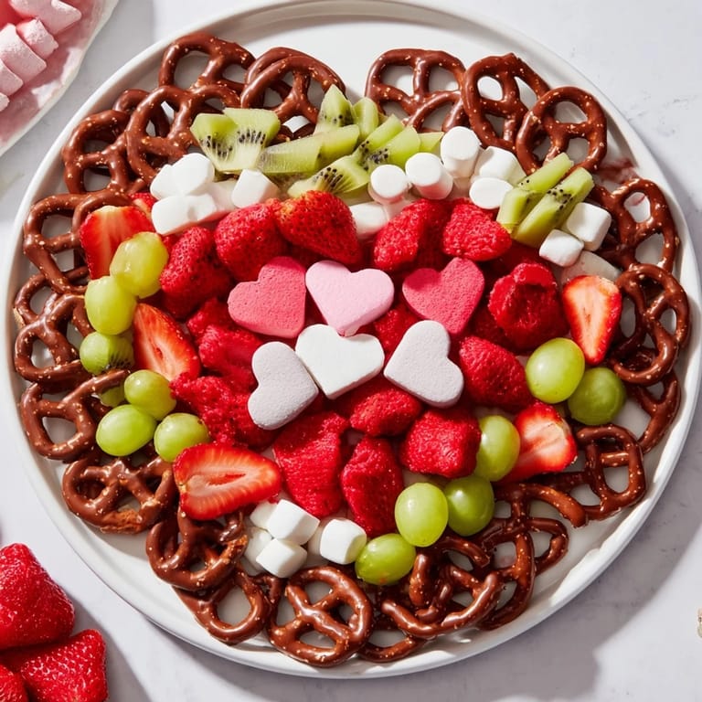 Bring a burst of holiday cheer to your table with vibrant hearts made from gummies and marshmallows, surrounded by an inviting heart-shaped fortress of pretzels and colorful fruits. This playful display invites guests of all ages to mix and match their favorite bites for a joyful snacking experience.