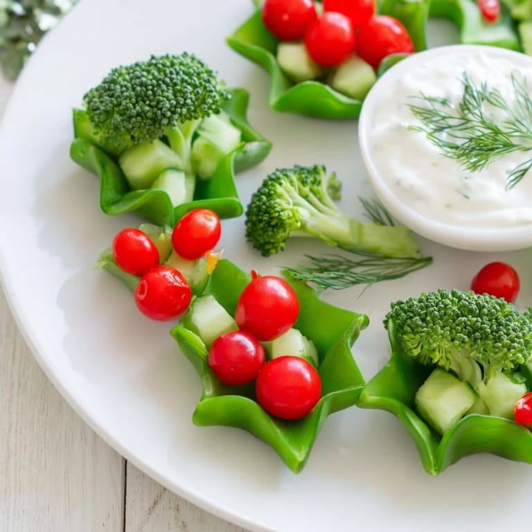 Save Celebrate the holidays with a festive and vibrant Holly Leaf Veggie Board that turns fresh, crunchy vegetables into an edible work of art. This colorful appetizer combines healthy veggies arranged in the shape of holly leaves, accented by bright cherry tomatoes and red bell pepper pieces that mimic holly berries. Paired with a creamy, flavorful Greek yogurt dip, this platter is as delightful to the eyes as it is to the palate, perfect for holiday gatherings and easy enough to prepare in under 30 minutes.