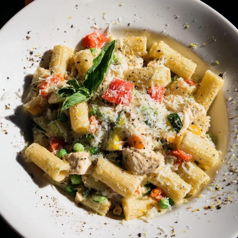 Save I discovered this pasta while staring at my fridge one Tuesday evening, surrounded by half-empty containers and the nagging feeling that something good was hiding in there. My roommate had left some cream, there was a lone chicken breast, and the pantry held odds and ends—exactly the kind of culinary puzzle that either becomes dinner or becomes regret. That night, I invented the 5-4-3-2-1 formula without meaning to, just grabbing five vegetables, four pantry basics, three cheeses, two garnishes, and one final flourish. What came out was so comforting and deliberately imperfect that I've made it dozens of times since, each version slightly different depending on what needs using up.