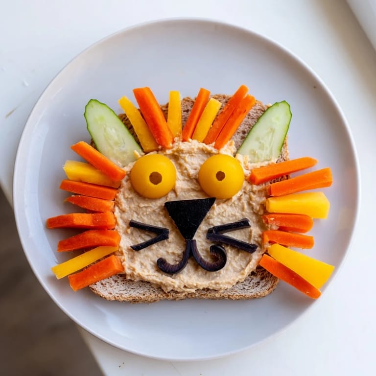 - Main Board Components: 4 whole wheat sandwich thins (for lions face), 1 cup hummus or cream cheese (for spreading), 1 cup shredded carrots (lions mane), 1 cup orange bell pepper strips (lions mane), 1 cup yellow cherry tomatoes, halved (mane accents), 1 cup cucumber slices (face accents), 8 black olives, pitted and sliced (eyes, nose, whiskers), 1 small apple, sliced (lions mouth), 4 slices cheddar cheese (cut into triangles for ears)
