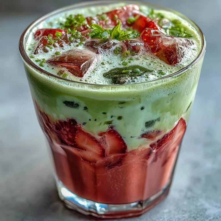 The secret to this drink's visual magic lies in the careful, unhurried layering of its three components. The vivid strawberry puree settles at the base, lightly sweetened with maple syrup and brightened with a touch of lemon juice. Chilled oat milk floats gently over the ice in the middle, and the frothy, whisked matcha crowns the glass in a swirl of deep jade green. Each layer has its own distinct flavour personality — fruity and floral, creamy and neutral, earthy and slightly grassy — and together they create a harmony that is both complex and completely approachable. Use culinary or ceremonial grade matcha for the best colour and flavour, and opt for barista-style oat milk for the creamiest result possible.
