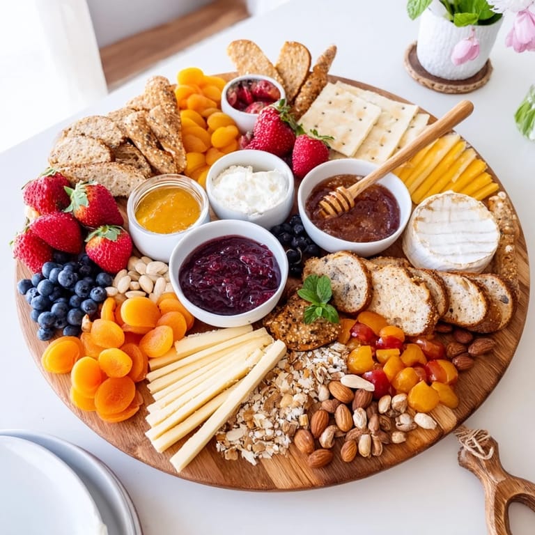 - Cluster strawberries, blueberries, grapes, and peach slices around the board for color and texture contrast.
