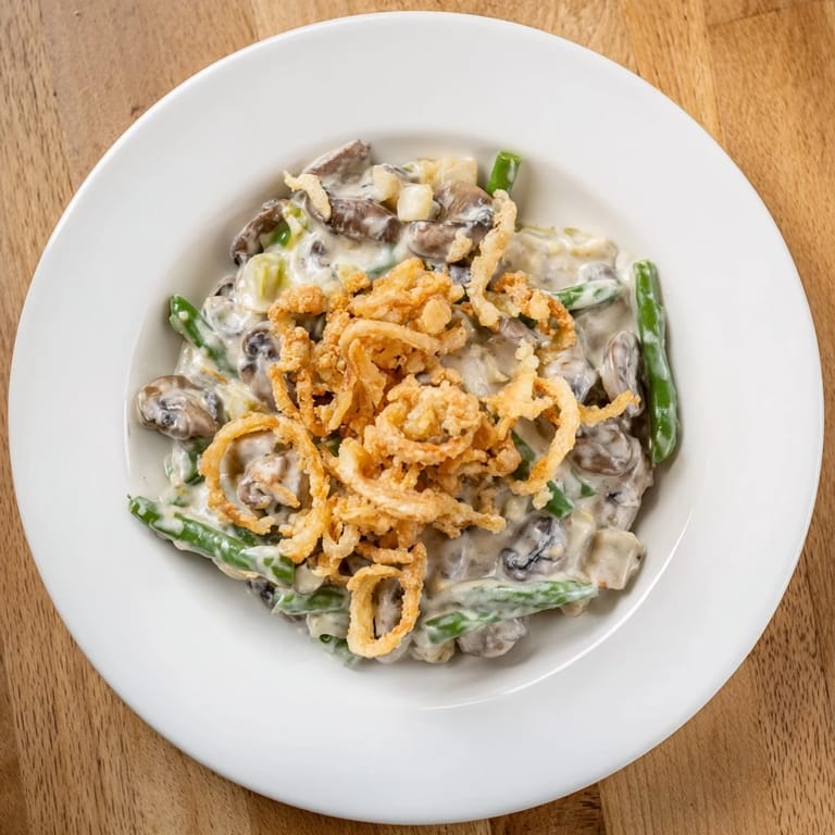 Tender green beans in a creamy mushroom sauce topped with crispy fried onions, perfect for holiday sides.