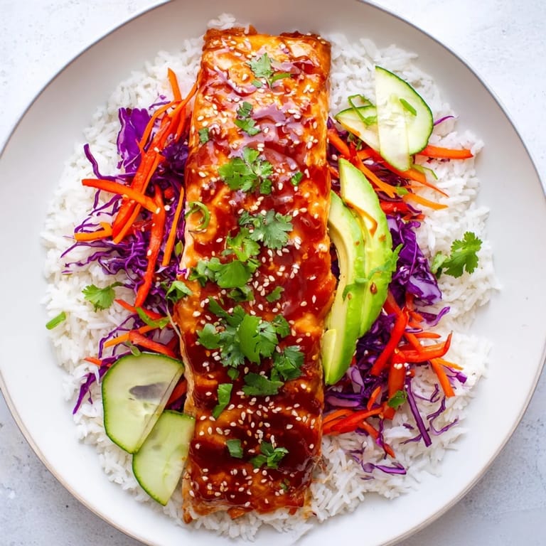 Save A vibrant rice bowl featuring tender salmon glazed with sweet chili sauce, served over fluffy rice and topped with fresh vegetables for a colorful, satisfying meal.
