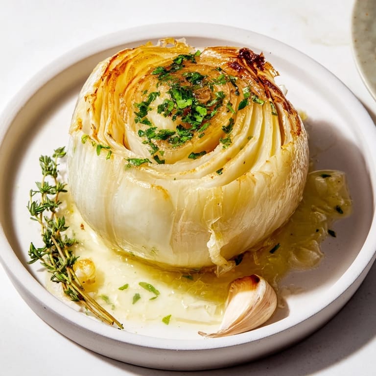 This dish features whole Vidalia onions roasted until tender and sweet, infused with butter, thyme, and garlic. Wrapped in foil and slow-cooked to a melting texture, the onions develop a rich flavor perfect for pairing with many meals. Simple preparation and oven roasting yield an elegant, aromatic side that highlights the natural sweetness of the onions. Garnish with fresh parsley to add freshness and complexity.