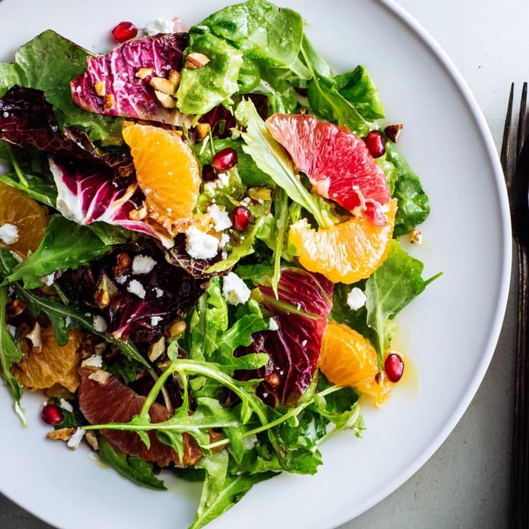 Bright mix of winter greens, citrus segments, pomegranate seeds, and toasted nuts in a light dressing.