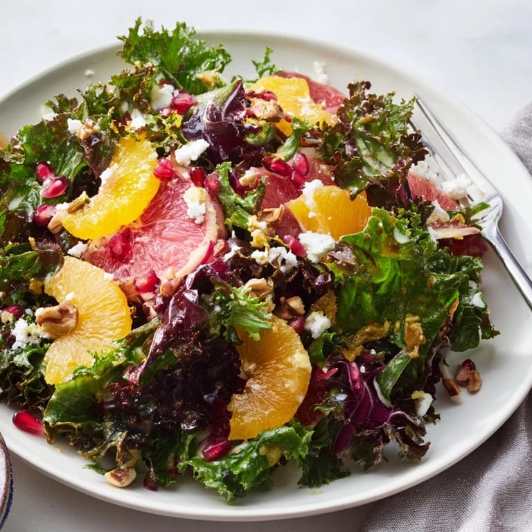 This vibrant salad features baby kale, arugula, and radicchio combined with fresh orange and grapefruit segments for bright citrus notes. Juicy pomegranate seeds add ruby bursts of flavor, while toasted mixed nuts contribute a crunchy texture. The dressing, made with olive oil, lemon and orange juices, Dijon mustard, honey, salt, and pepper, ties all elements together harmoniously. Optional feta and fresh herbs add creamy and fresh accents. Ideal for a light, refreshing dish to elevate chilly days.